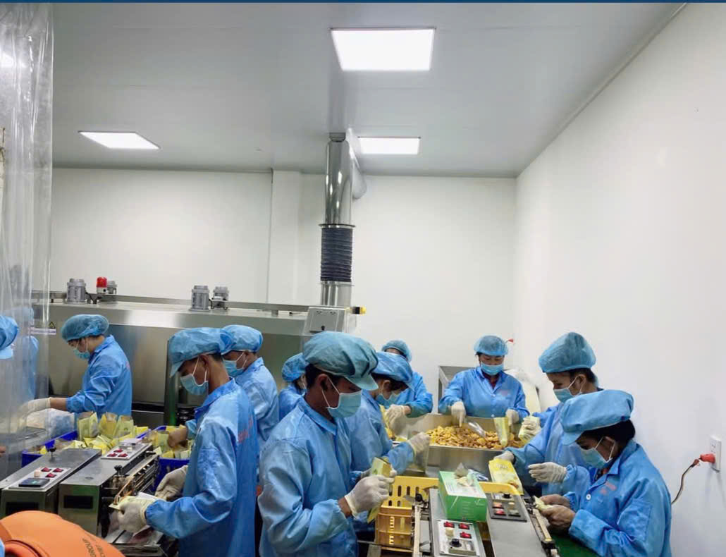 Nhìn vào hình ảnh từ dây chuyền sản xuất, bạn có thể thấy sự tỉ mỉ và cẩn thận trong từng công đoạn. Mít tươi được lựa chọn kỹ càng, sau đó được đưa vào quy trình sấy khô bằng công nghệ hiện đại. Quy trình này giúp giữ trọn hương vị tự nhiên của mít, đồng thời vẫn đảm bảo độ giòn và hương thơm đặc trưng. Các công nhân làm việc trong môi trường sạch sẽ và đảm bảo chất lượng, từ khâu sơ chế đến đóng gói sản phẩm cuối cùng.